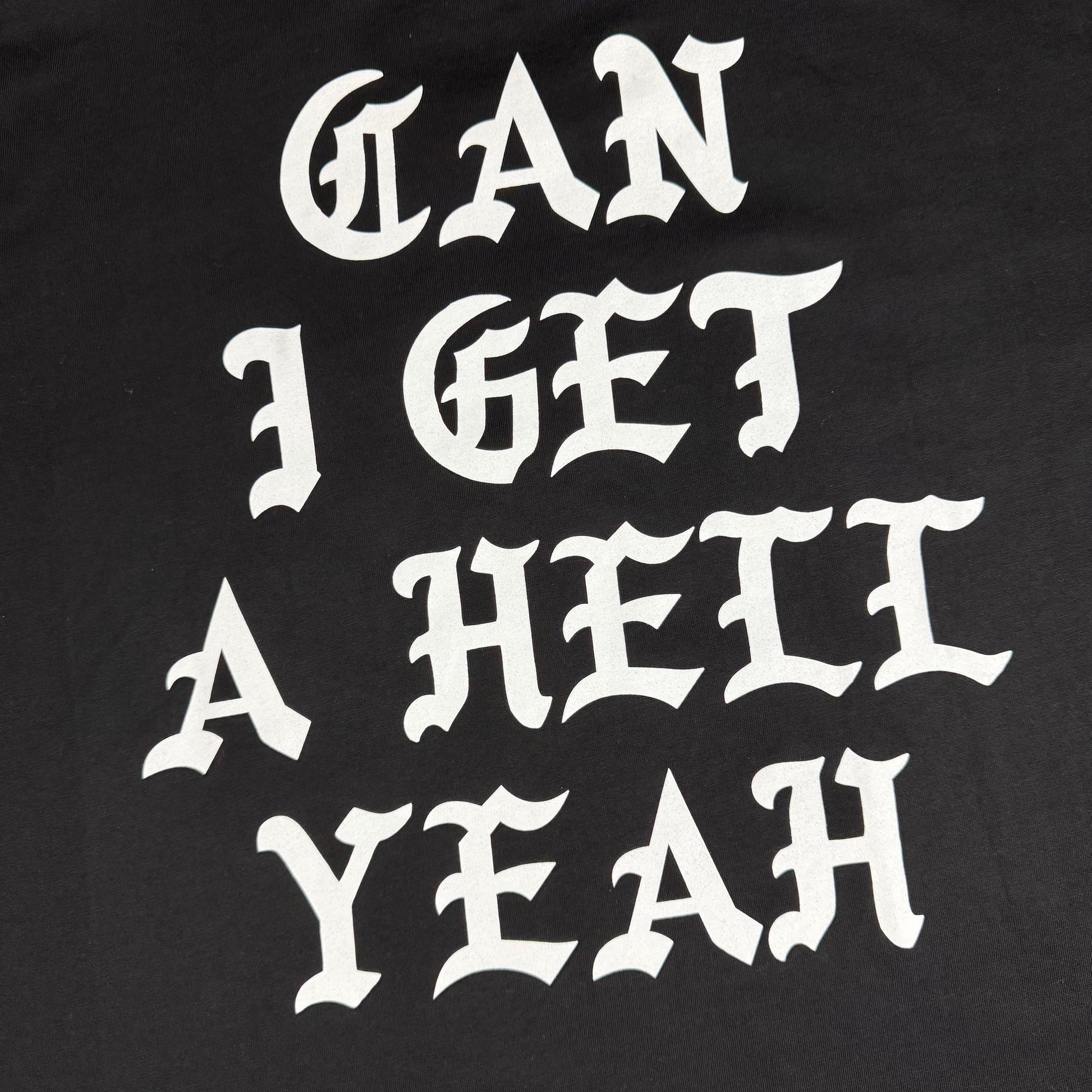• Back features large gothic “CAN I GET A HELL YEAH” type in white
