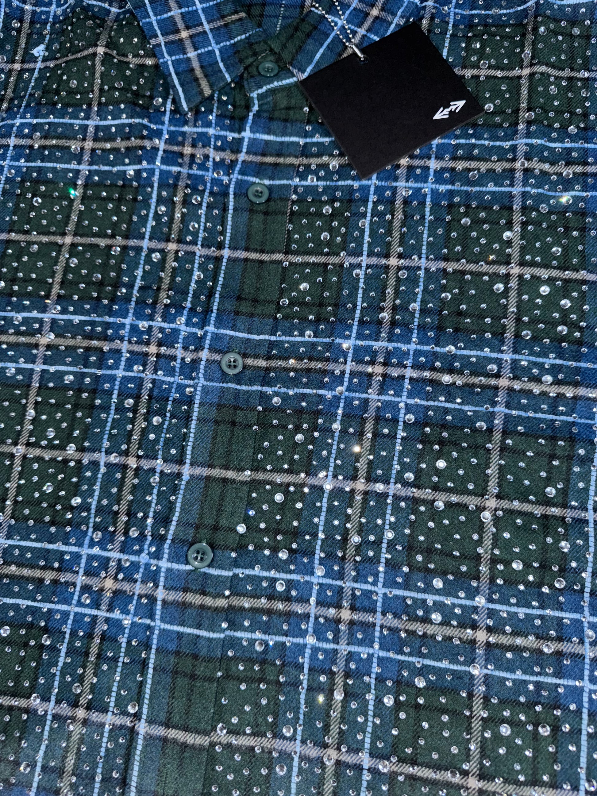 • Black and blue plaid flannel with all-over rhinestone detailing