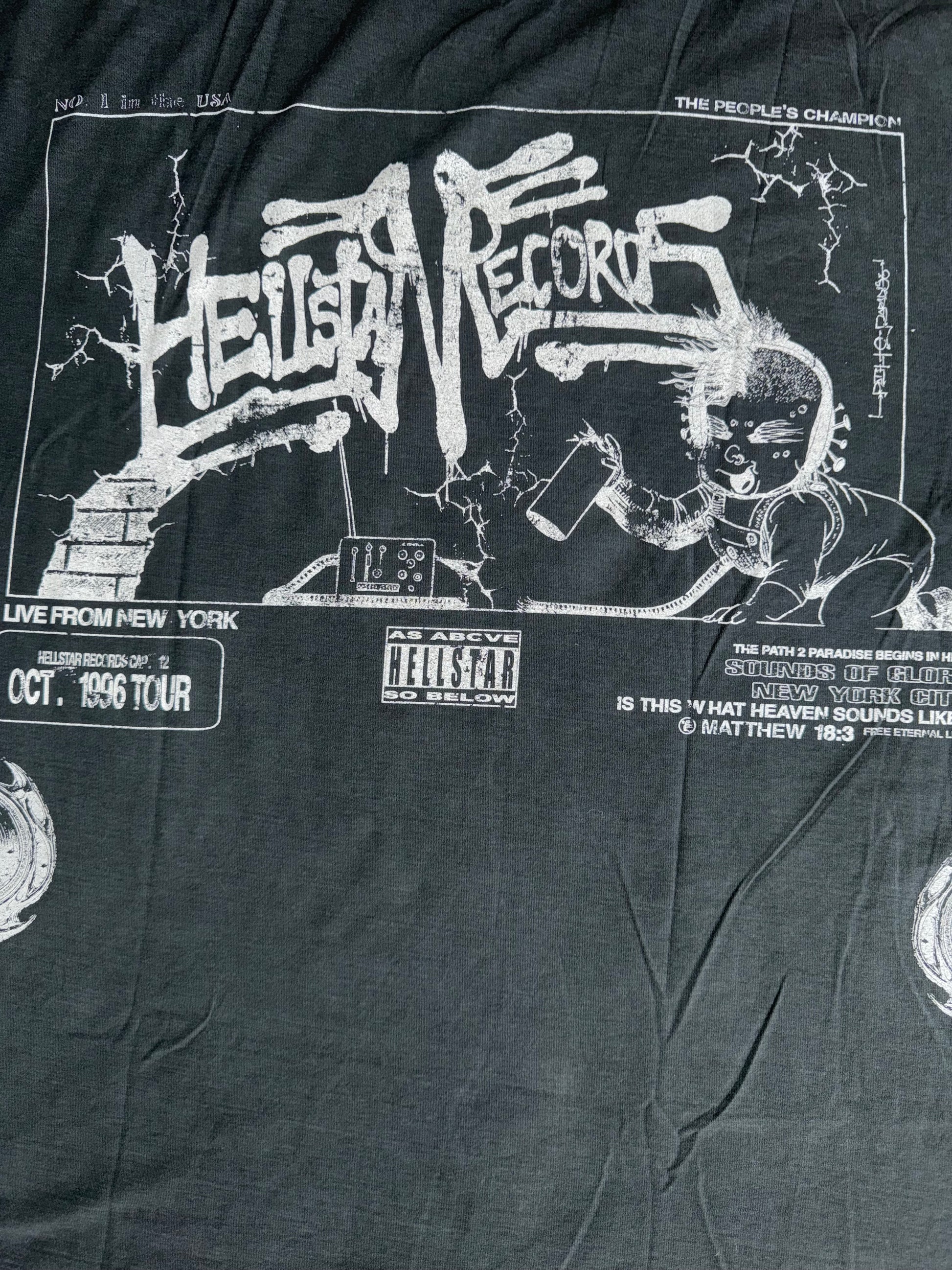 • Hellstar Records “1996 Tour” graphic tee with baby illustration and brick wall backdrop