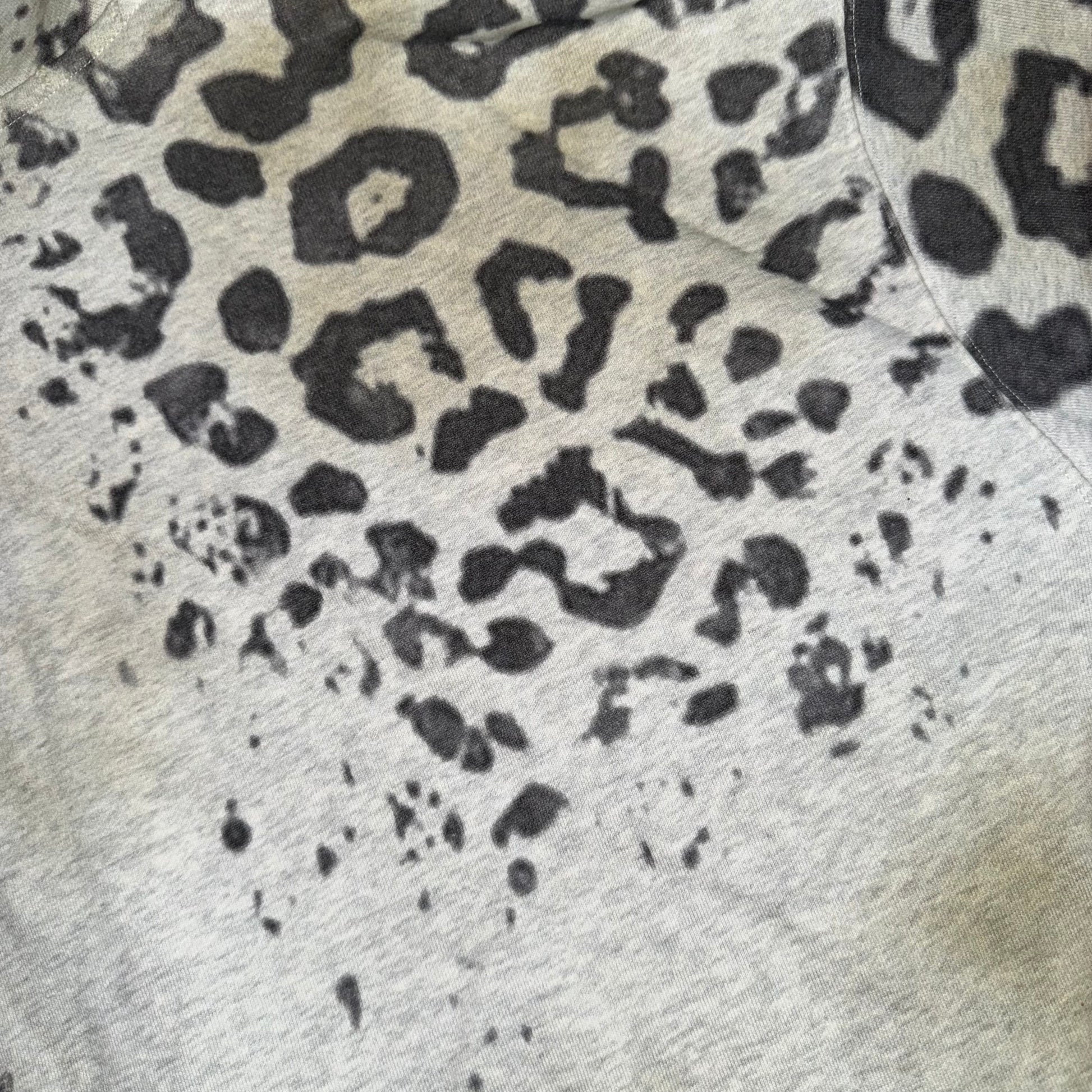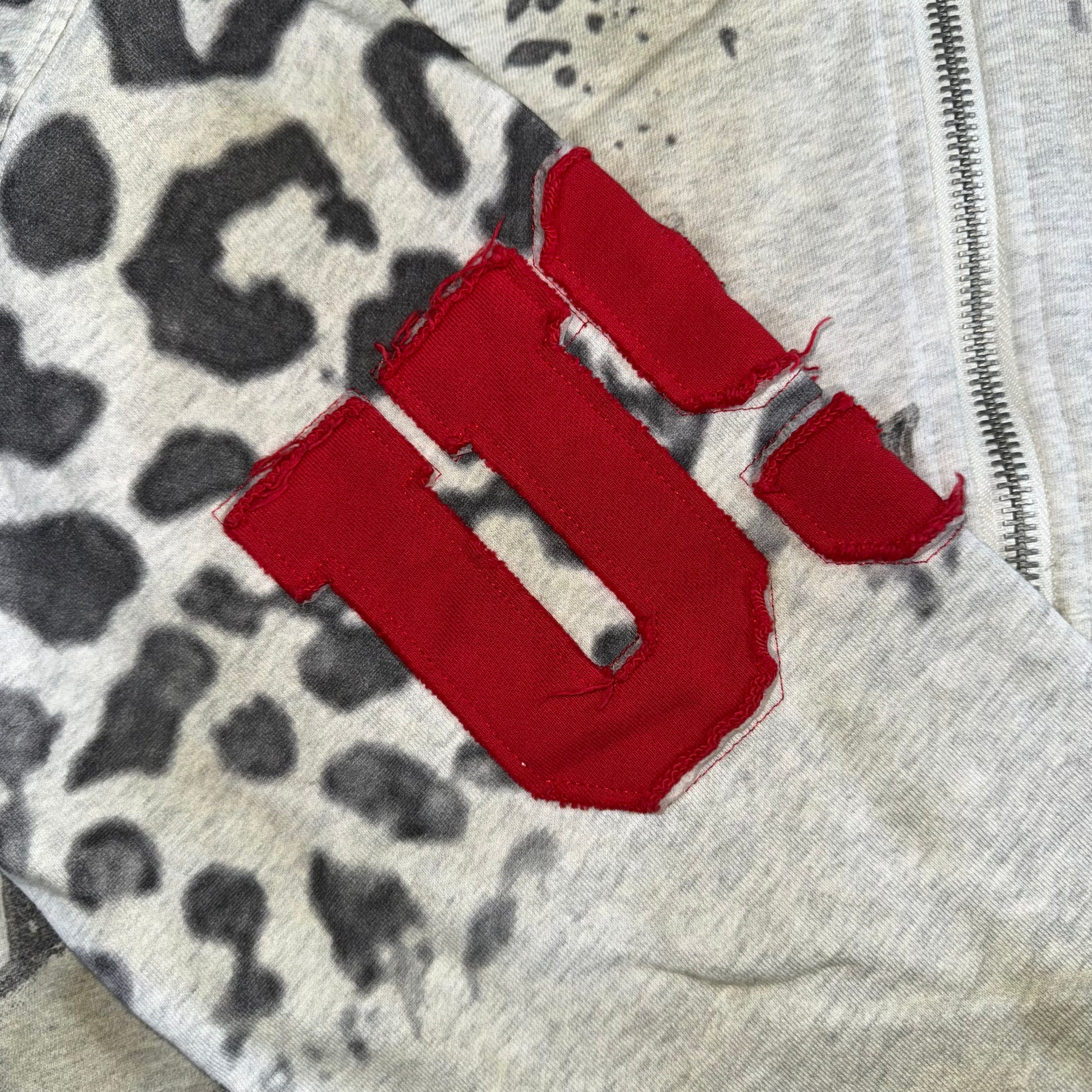 • Distressed zip-up hoodie with custom cheetah print and faded wash throughout